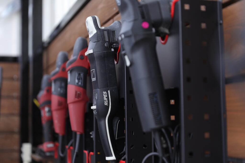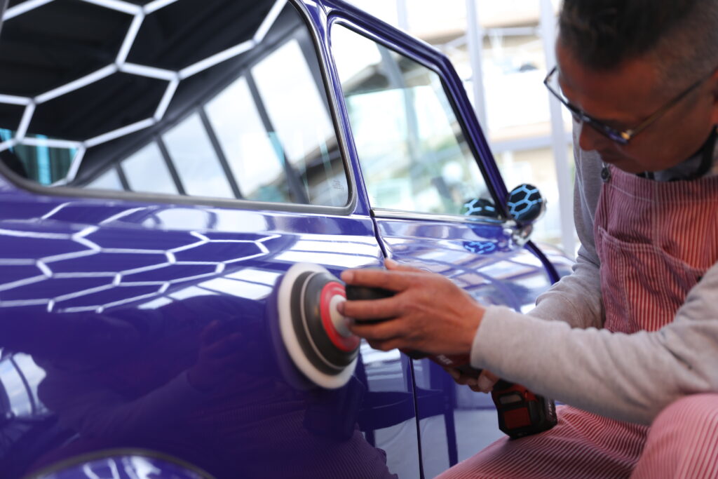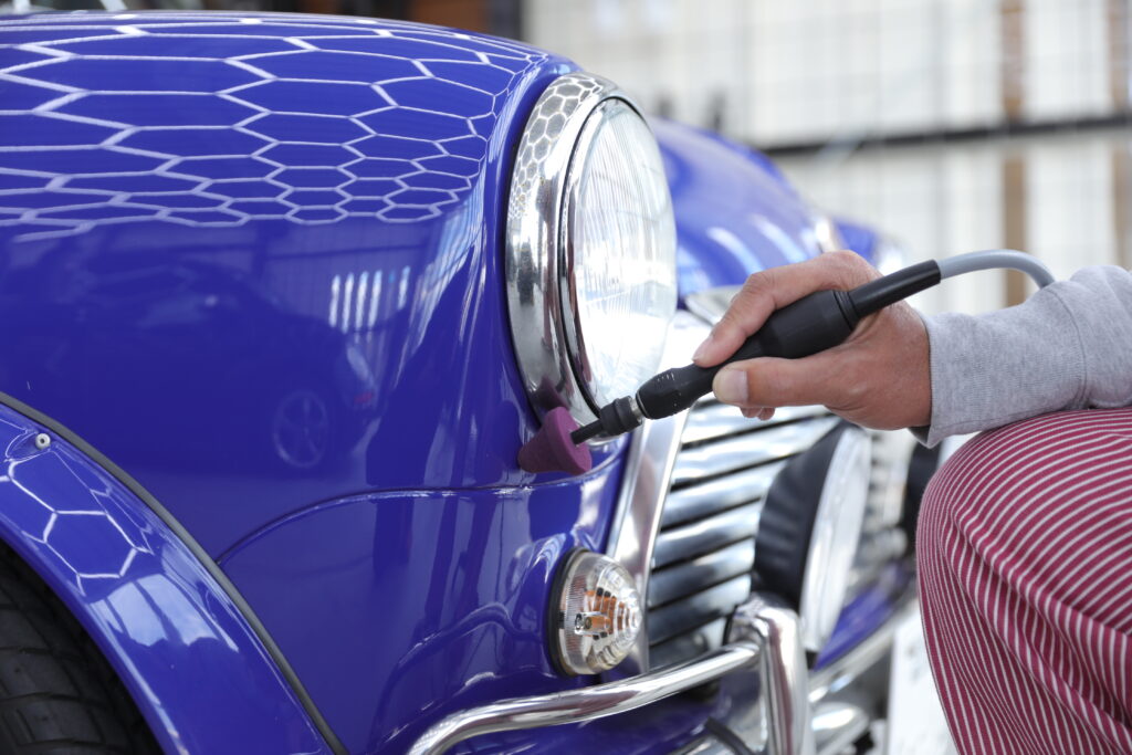 専用照明で塗装を精査し、残った小キズや曇りを丁寧に磨き上げます。スケールを適切に除去した状態で研磨するため、艶の深みや透明感がより一層引き立ちます。車種や塗装の特性に合わせた段階的な研磨で、必要最小限の除去にとどめつつ美しさを追求します。