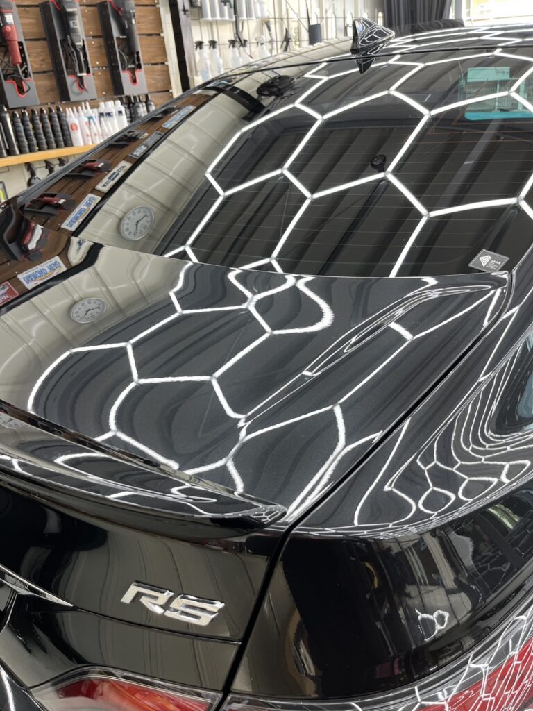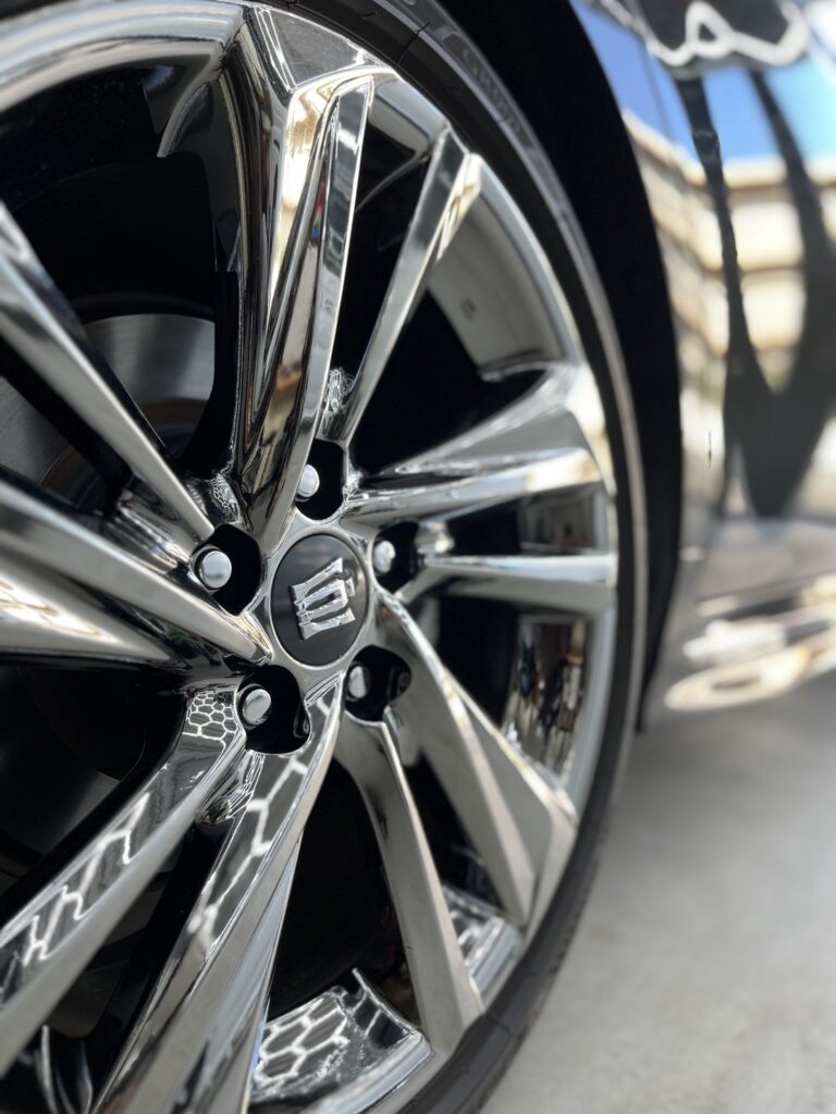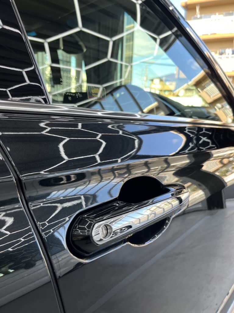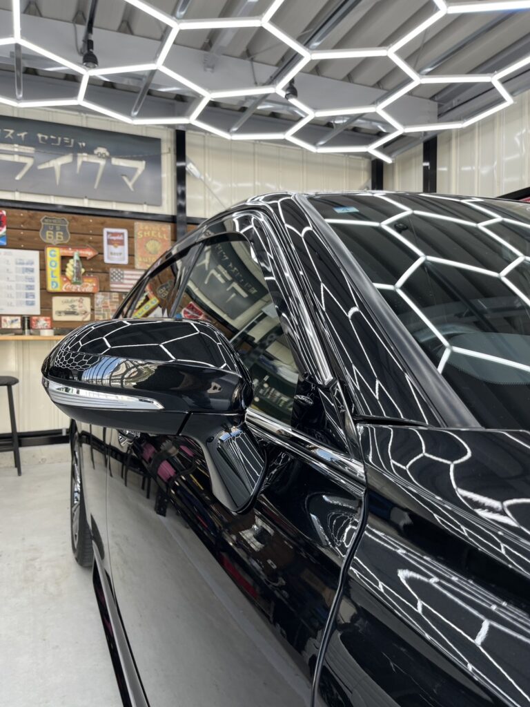 もともと残っていた、コーティング被膜を除去し、ボディ全体にあったくすみ・線キズ・ウォータースポット等を研磨にて除去し、ブラックメタリック本来の艶を取り戻したうえで5年耐久のセラミックウルトラ+1年耐久のオリジナルセラミックをWで施工しました。塗り重ねることによって、表面の1年耐久が犠牲被膜となり、5年コーティングの層を保護してくれます。ガラス全面・ホイール・メッキモール等もコーティングさせていただきました。維持の難しいブラックを汚れやキズから守り、お手入れを劇的に楽にするコーティングとなります。