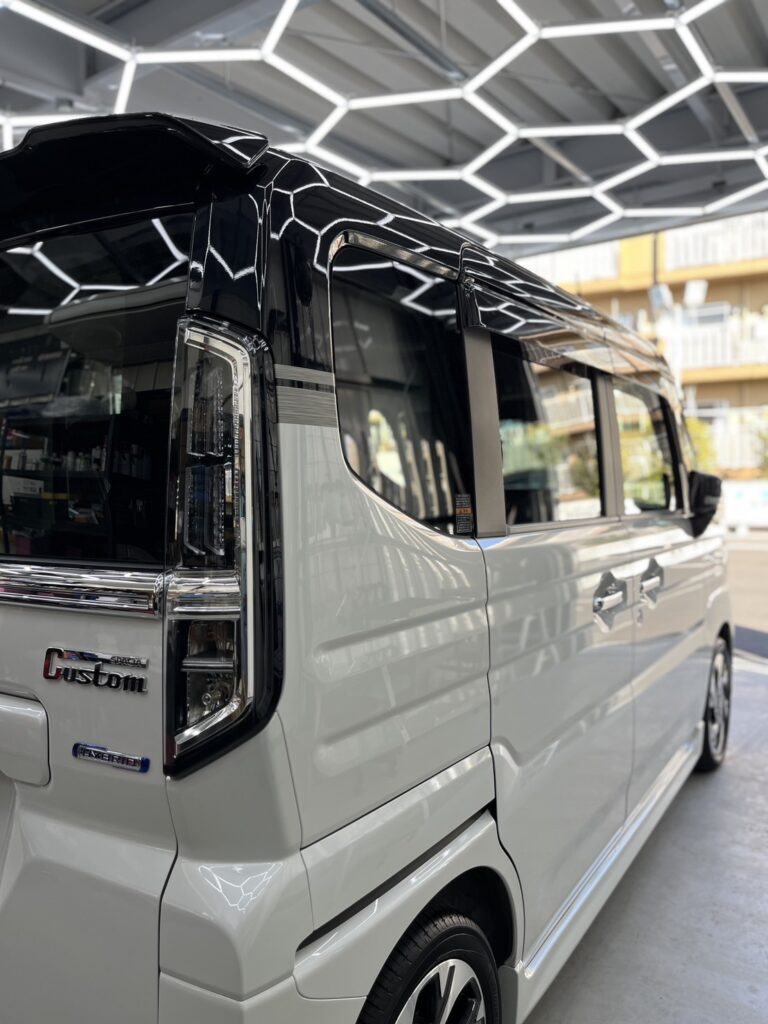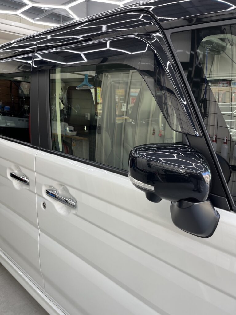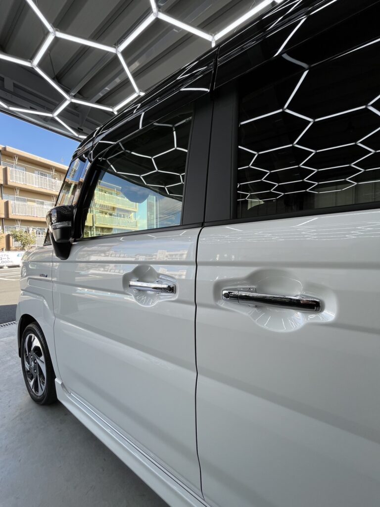 昨今の軽自動車は、塗装技術の進歩により塗膜が非常に薄く何度も研磨することができません。よって、新車のうちにしっかりとしたコーティング被膜を形成させ保護することが重要になっております。セラミックコーティングは非常に硬い被膜を形成するため、5年以上の耐久性を年に1回メンテナンスをすることで、維持することができます。合わせてガラス全面も施工させていただきました。